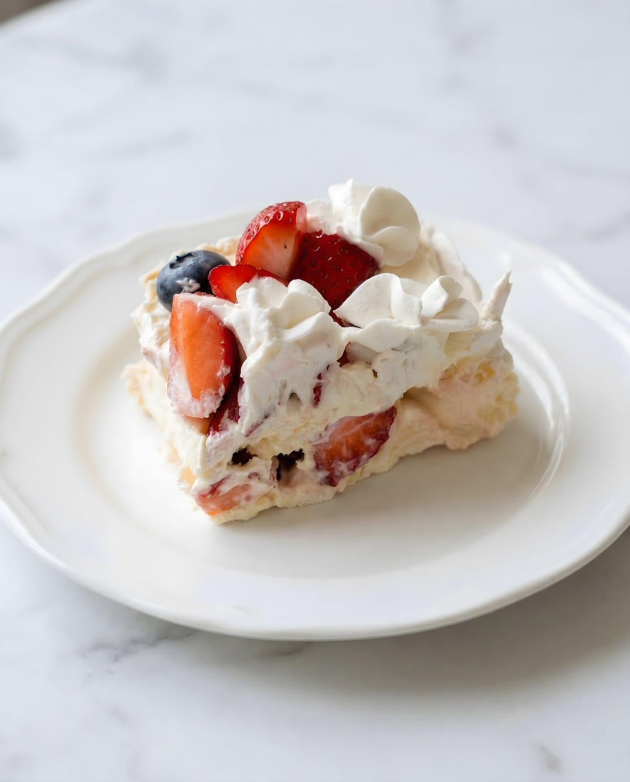 Kombinacija puslice, laganog krema i svežih jagoda, malina i borovnica.