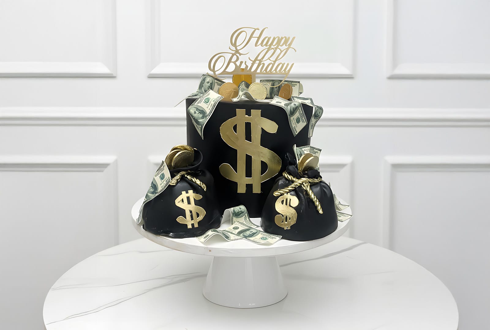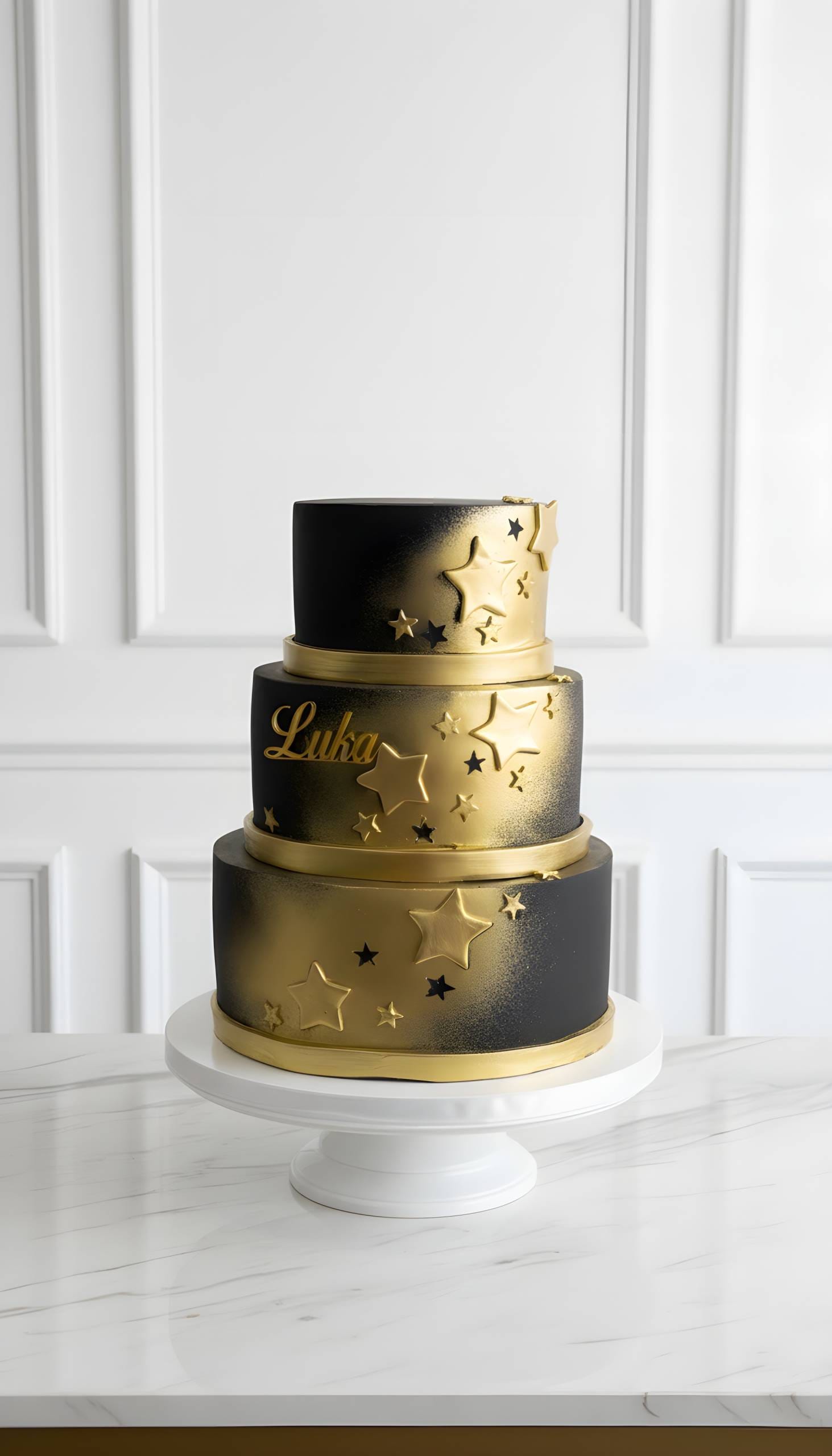 - Crnu tortu sa zlatnim detaljima i dominantnim brojem 18